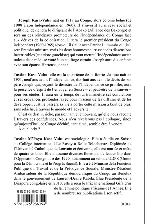 Justine Kasa-Vubu est la quatrième de la fratrie Kasa-Vubu. Justine naît en 1951, neuf ans avant l’Indépendance, dix-huit ans avant le décès de son père Joseph qui, voyant le désastre de l’Indépendance se profiler, aura la présence d’esprit de l’envoyer en Suisse – et peut-être de la sauver – pour ses études. Il aura eu le temps de lui transmettre ses convictions et ses croyances profondes, avec pour mission de les diffuser et de les développer. Justine passera sa vie à porter cette mission à bout de bras, sans relâche, à travers le monde et l’adversité.