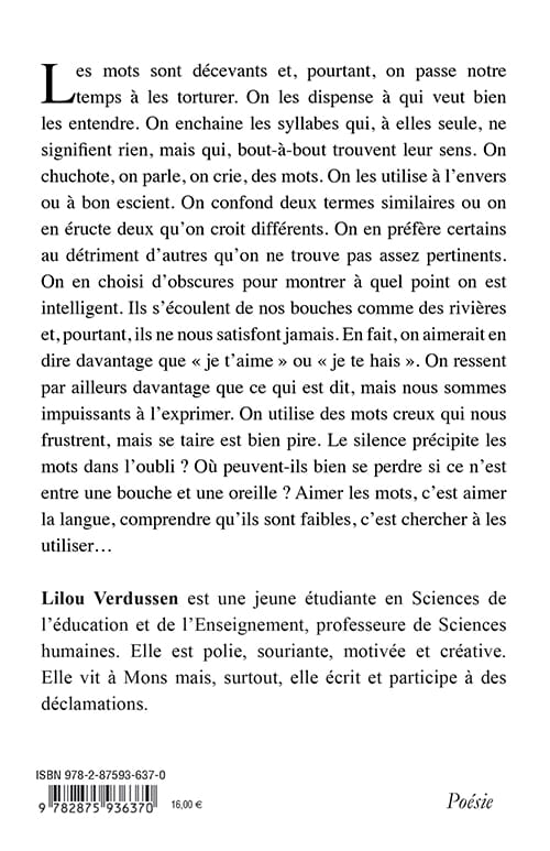 Lilou Verdussen est une jeune étudiante en Sciences de l’éducation et de l’Enseignement, professeure de Sciences humaines. Elle est polie, souriante, motivée et créative. Elle vit à Mons mais, surtout, elle écrit et participe à des déclamations.